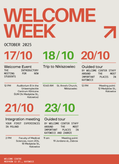 as the staff of the Welcome Centre of the Medical University of Silesia, we are pleased to invite you to take part in Welcome Week – a series of events we prepared for new foreign students of our University.